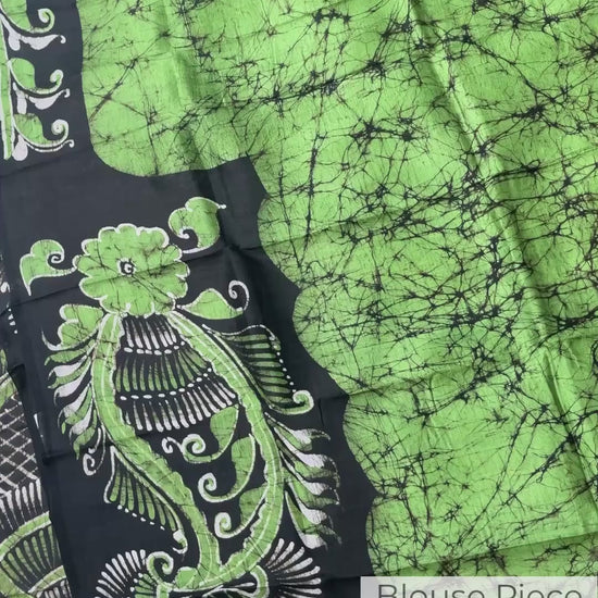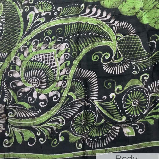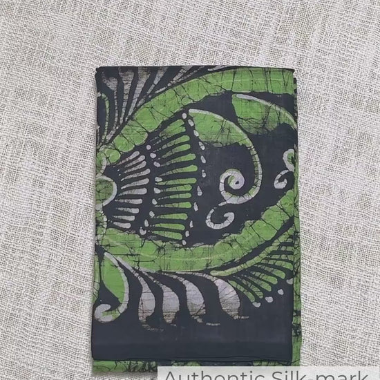 A dance of nature and craft —Aranya Jyoti flows in lush green silk kissed by midnight black. It feels like draping a serene forest breeze, alive with quiet artistry. The soft crackle of the batik tells its own story — each line a path, each shade a mood.