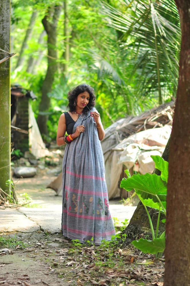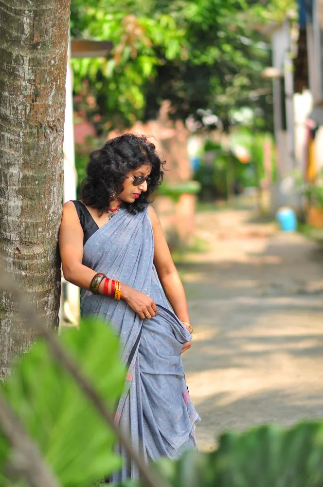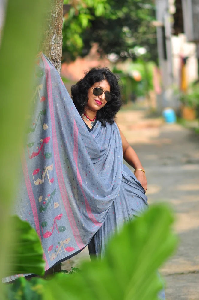 Soothing grey body adorned with all-over woven motifs and a striking black border for just the right contrast. The pallu features intricate Jamdani work — adding a quiet flair that flows with your mood.