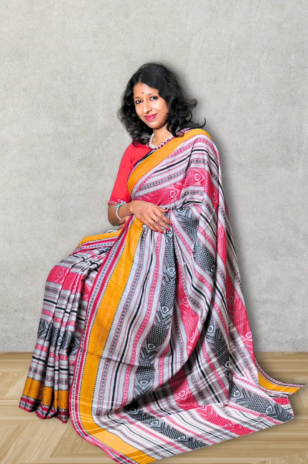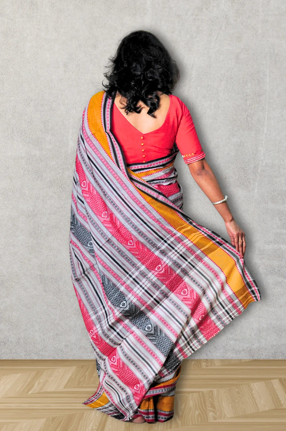 The diagonal stripes sculpt the frame, the colour palette is confident without trying too hard, and the fish motifs add a layer of meaning that only handlooms can carry — subtle, soulful, and full of cultural memory. It looks stunning at work, festive enough for a gathering, and absolutely effortless for a regular day.
