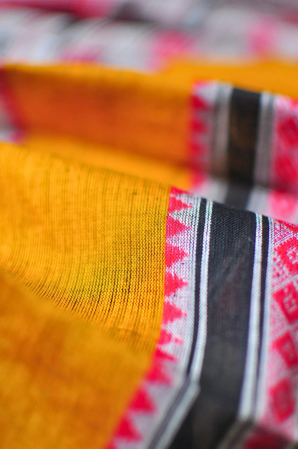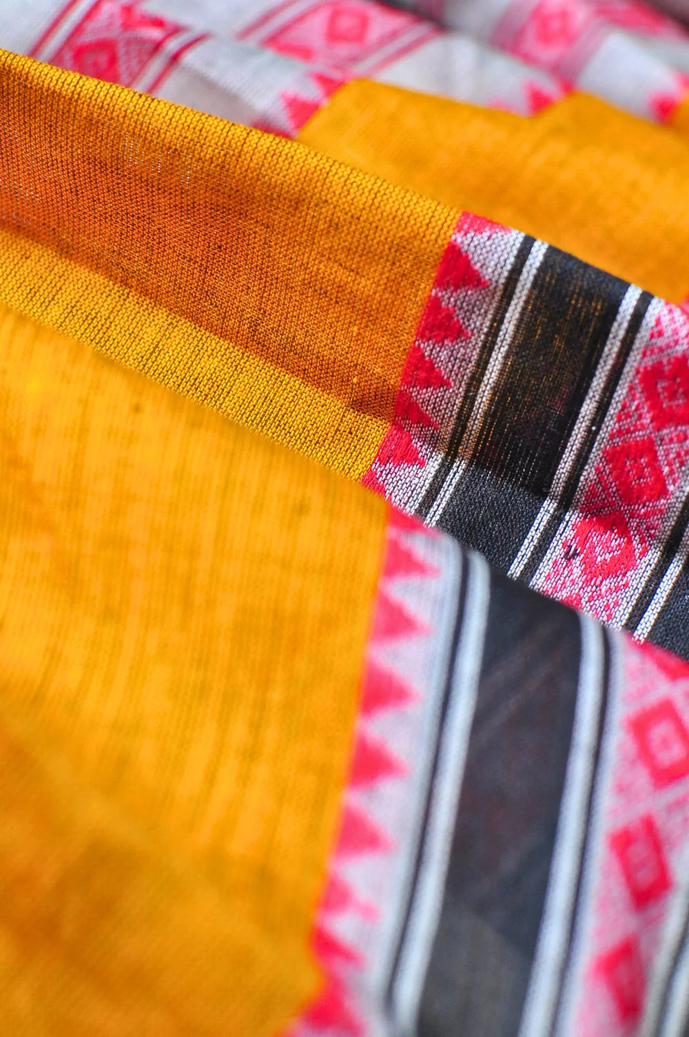 • Don’t wring harshly — Dhaniakhali weaves respond better to patience