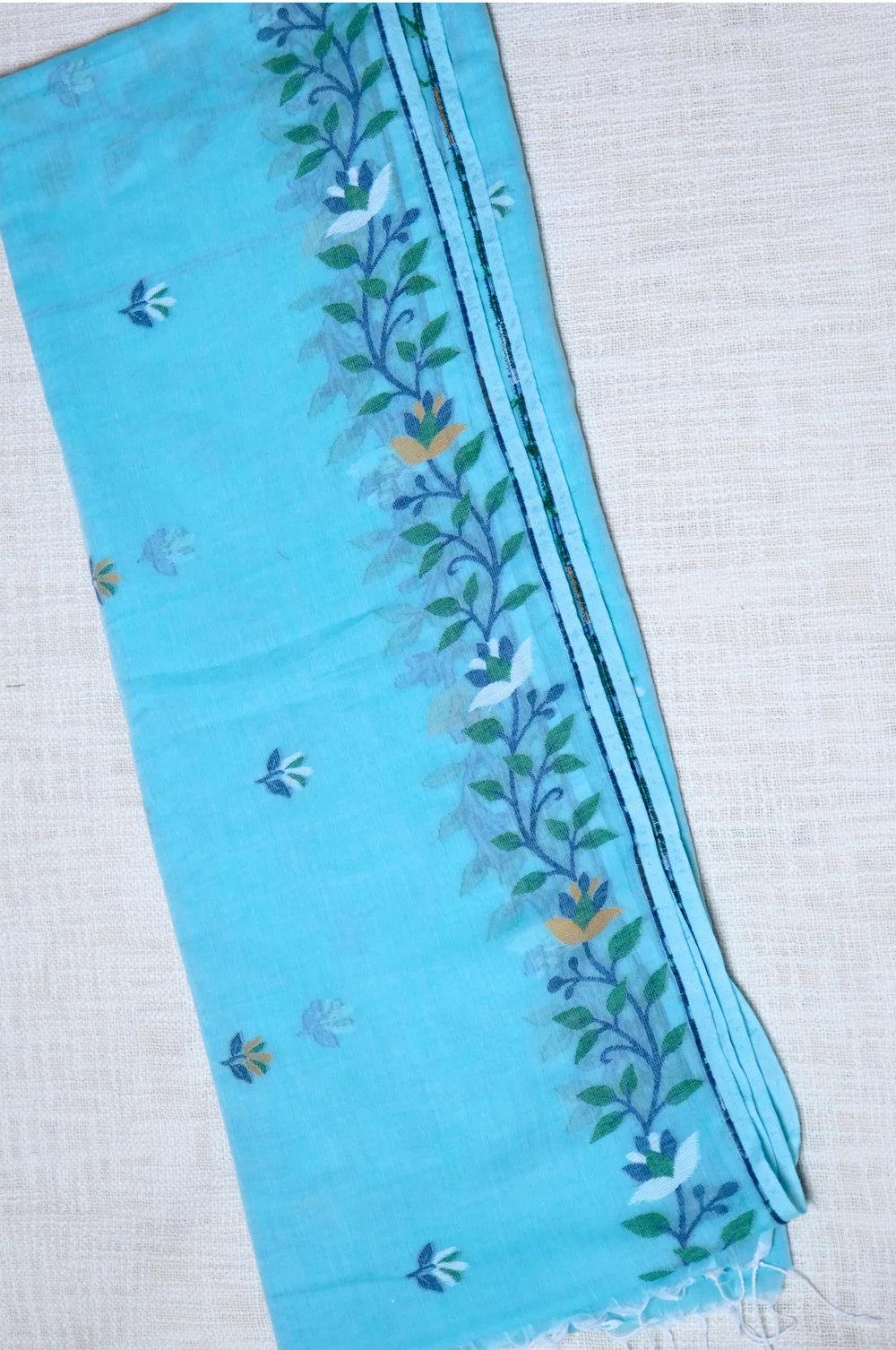 As gentle as a morning breeze and as elegant as the peacock it adorns, this Khadi Jamdani drapes like poetry in motion. The soft blue hue carries a calm, grounded grace — while the intricate Jamdani weave and the delicate peacock motif on the pallu add a touch of quiet regality.