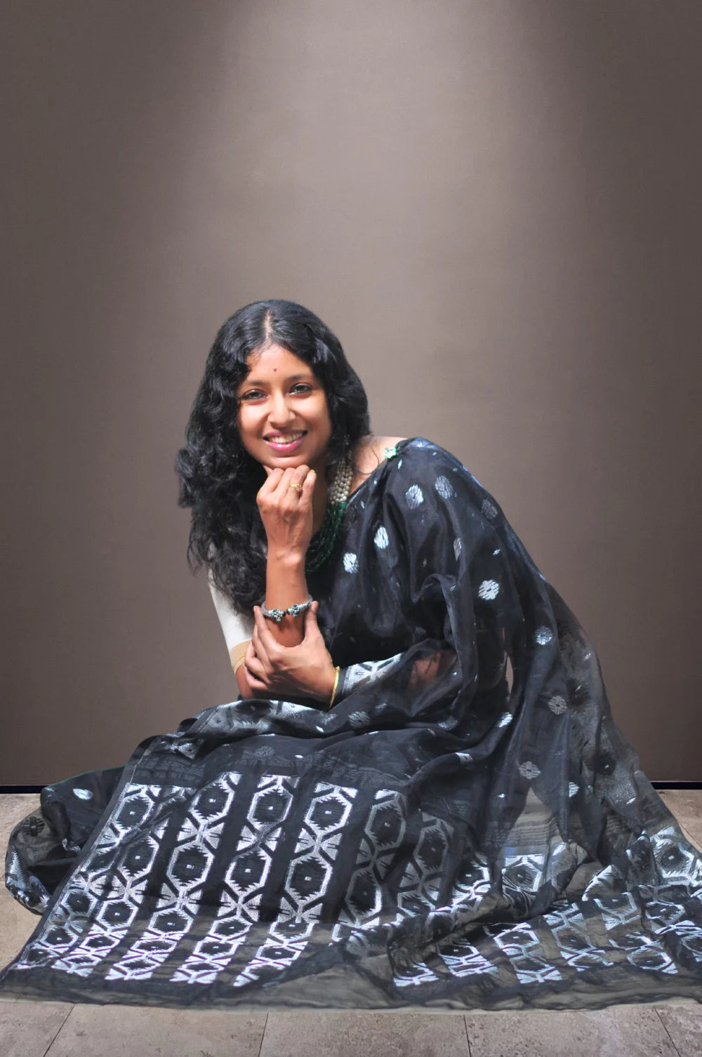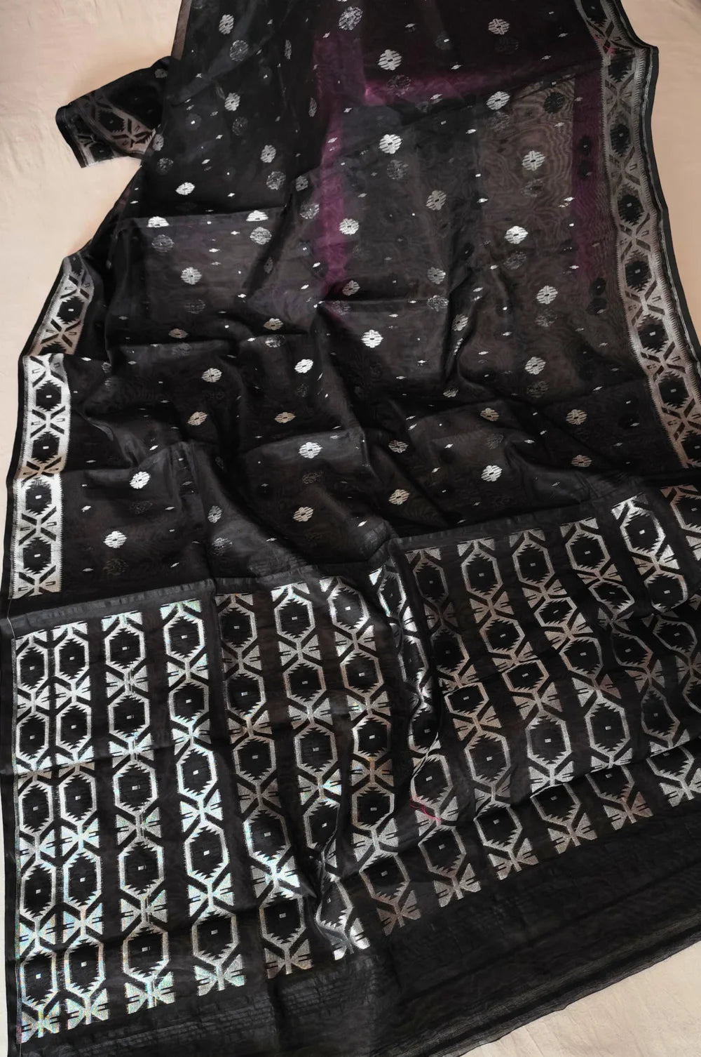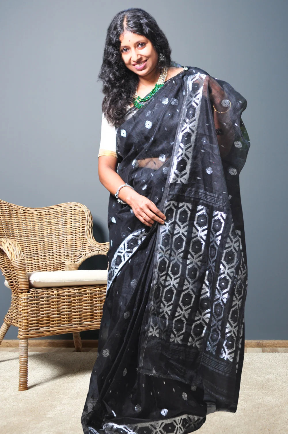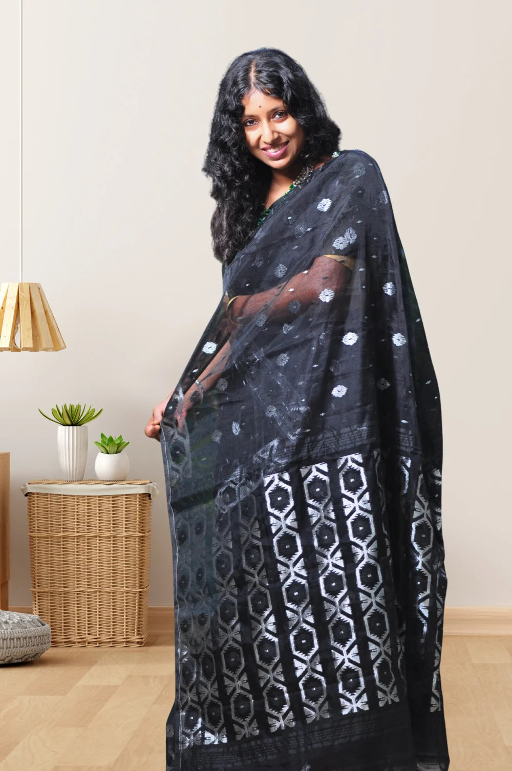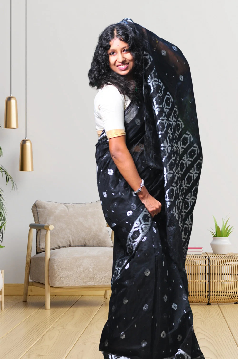 Unveil your inner diva with Meherbaan, a dazzling black Tissue Jamdani saree where tradition meets shimmer. The delicate silver motifs, handwoven with finesse, float across the lustrous tissue base like stars on a moonless night — bold, beautiful, and breathtaking.