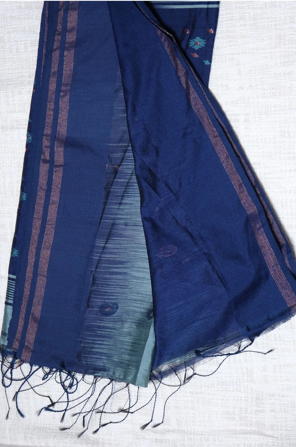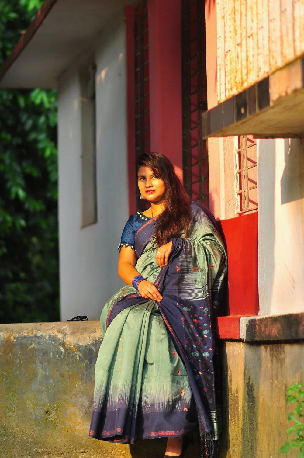 A stunning blend of serenity and sophistication — this handloom Jamdani saree drapes you in calm elegance. The soothing sea green body flows gracefully into a deep navy pallu adorned with delicate woven motifs, celebrating the artistry of traditional craftsmanship. It’s perfect for those who carry grace effortlessly — quiet yet captivating.