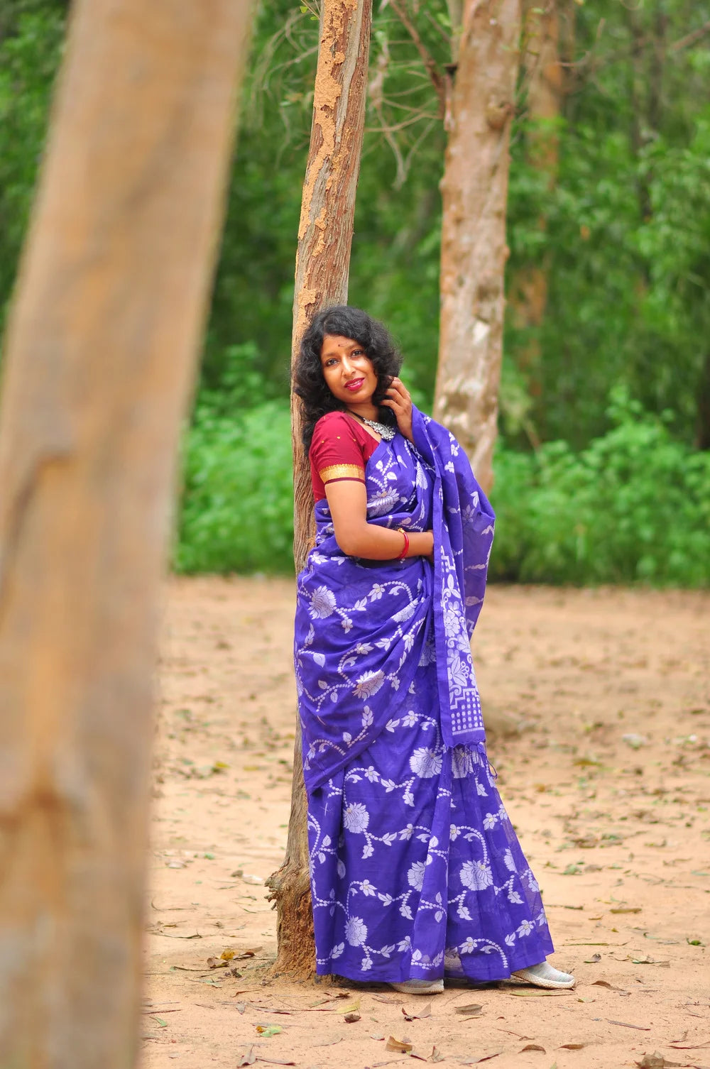When elegance meets ease — that’s Shimmering Violet Dream. This authentic Jamdani saree in a deep violet tone is adorned with delicate silver floral work all over, giving it a quiet festive charm that doesn’t try too hard yet turns every head. Perfect for those who love understated grace with a touch of sparkle.
